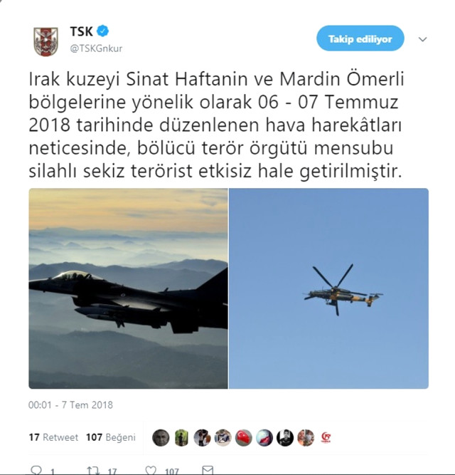 Türk Silahlı Kuvvetleri (TSK), Irak’ın kuzeyindeki Sinat Haftanin bölgesiyle Mardin’in Ömerli ilçesinde düzenlenen hava harekatlarında 8 teröristin etkisiz hale getirildiğini açıkladı. TSK’dan yapılan yazılı açıklamada, ‘Irak kuzeyi Sinat Haftanin ve Mardin Ömerli bölgelerine yönelik olarak 06-07 Temmuz 2018 tarihinde düzenlenen hava harekatları neticesinde, bölücü terör örgütü mensubu silahlı 8 terörist etkisiz hale getirilmiştir’ denildi.