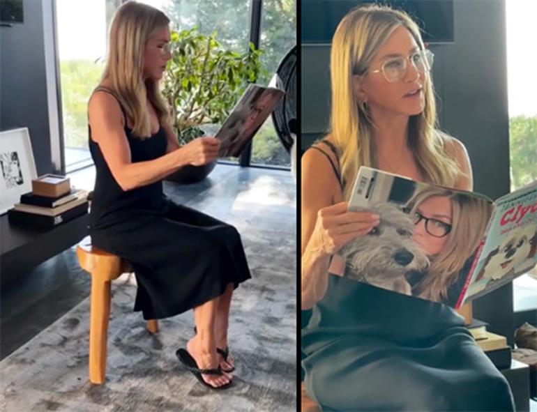 Görüntüler sahiden de şirindi aslında. Aniston, oturma odasının bir köşesinde köpeklerine kendisinin kaleme aldığı Clydeo Takes a Bite Out of Life isimli kitaptan kısımlar okuyordu.