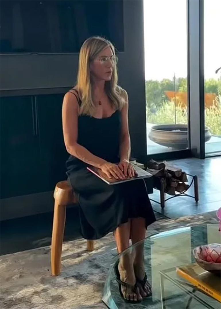 Videoda Jennifer Aniston, üzerinde siyah ve uzun bir elbiseyle TV ünitesinin önünde otururken görülüyor.