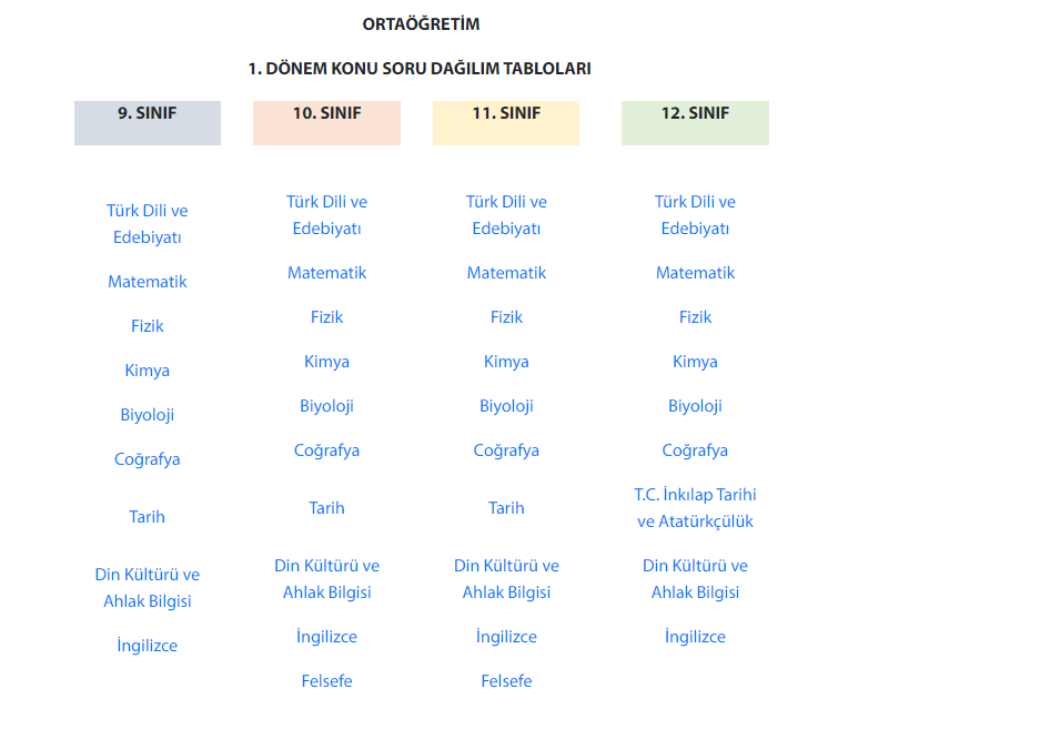 Ortak imtihan mevzu soru dağılım tablolarına ulaşmak için tıklayınız.