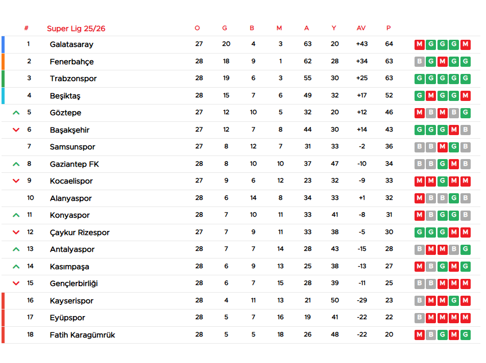 Galatasaray 64 puanla tepedeki yerini korurken, Trabzonspor 63 puanla 3. sırada, Beşiktaş 52 puanla 4. sırada bulunuyor.