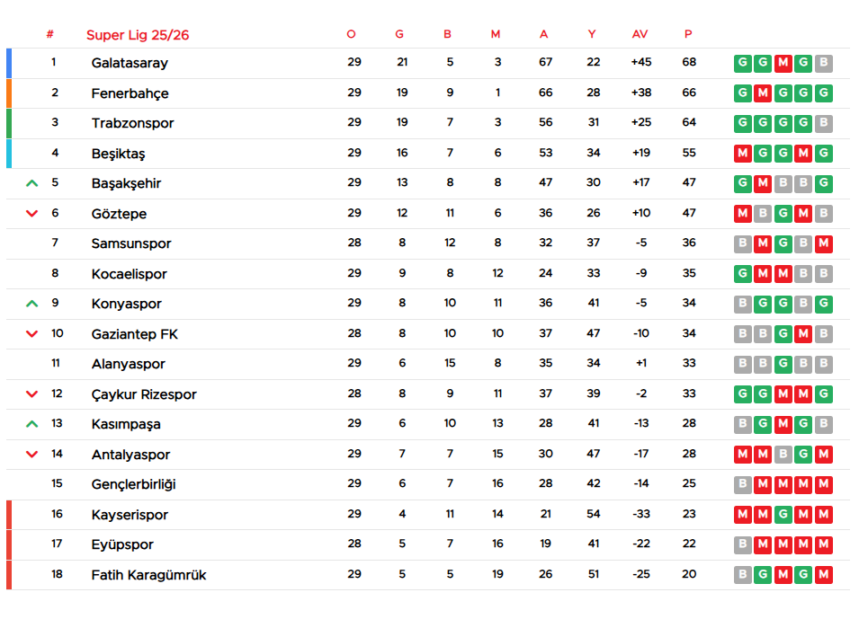 | 1 | Galatasaray | 29 | 21 | 5 | 3 | 67 | 22 | +45 | 68 |